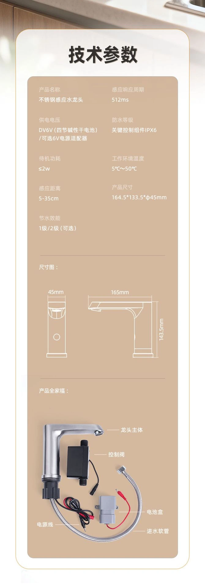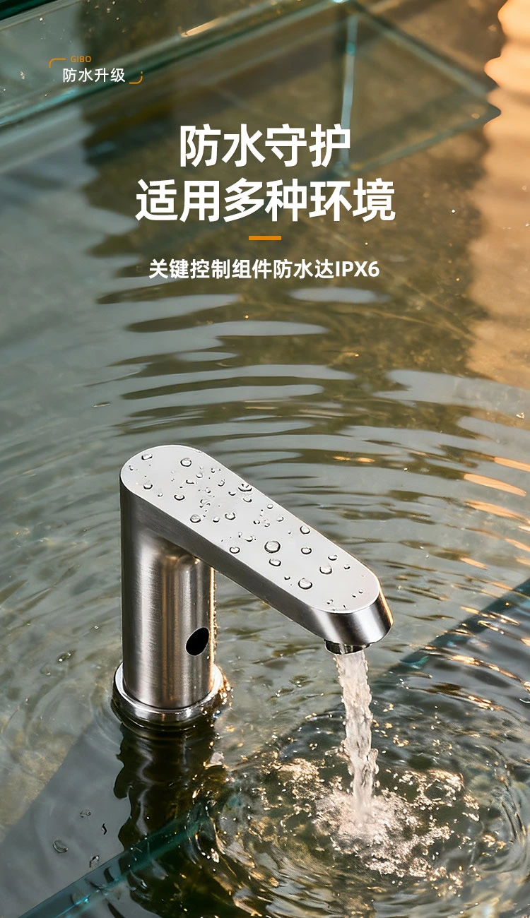 洁博利感应龙头产品理论设计寿命为50万次,使用直流6V供电,均可选适配使用4节5号电池、交流110V/220电源适配器供电;若使用4节5号电池供电,按照每天使用100次计算,理论上可以使用超过500天。