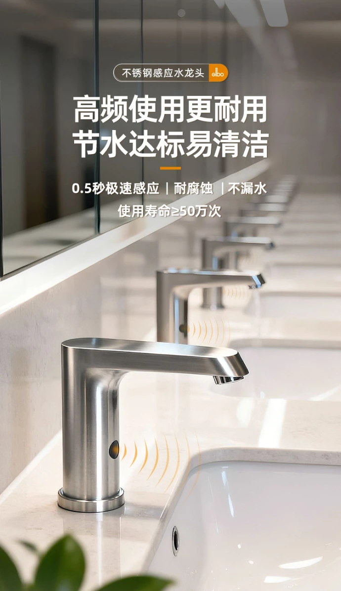 洁博利感应龙头产品理论设计寿命为50万次,使用直流6V供电,均可选适配使用4节5号电池、交流110V/220电源适配器供电;若使用4节5号电池供电,按照每天使用100次计算,理论上可以使用超过500天。